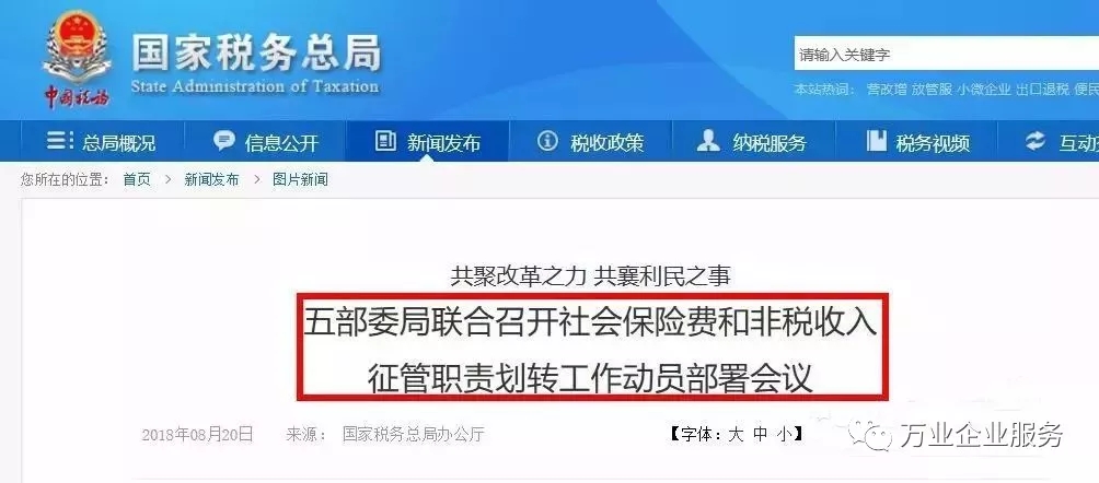 根據(jù)之前國家稅務(wù)總局、財政部、人力資源和社會保障部、國家衛(wèi)生健康委員會、國家醫(yī)療保障局視頻會議部署,今年12月10日前要完成社會保險費和第一批非稅收入征管職責(zé)劃轉(zhuǎn)交接工作,自2019年1月1日起由稅務(wù)部門統(tǒng)一征收各項社會保險費和先行劃轉(zhuǎn)的非稅收入。