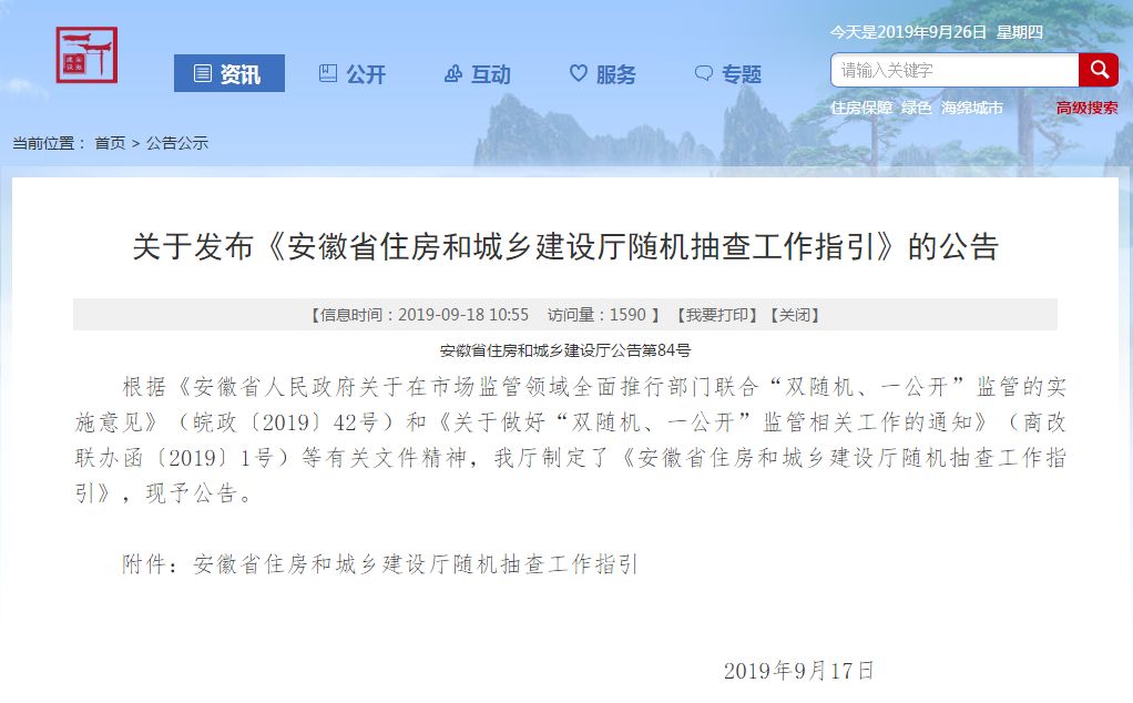 近日,安徽省住房和城鄉(xiāng)建設(shè)廳根據(jù)《安徽省人民政府關(guān)于在市場監(jiān)管領(lǐng)域全面推行部門聯(lián)合“雙隨機、一公開”監(jiān)管的實施意見》(皖政〔2019〕42號)和《關(guān)于做好“雙隨機、一公開”監(jiān)管相關(guān)工作的通知》(商改聯(lián)辦函〔2019〕1號)等有關(guān)文件精神,制定了《安徽省住房和城鄉(xiāng)建設(shè)廳隨機抽查工作指引》
