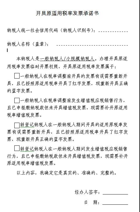 2.自2019年9月20日起,納稅人需要通過增值稅發(fā)票管理系統(tǒng)開具17%、16%、11%、10%稅率藍字發(fā)票的,應向主管稅務機關提交《開具原適用稅率發(fā)票承諾書》(附件2〕,辦理臨時開票權限。