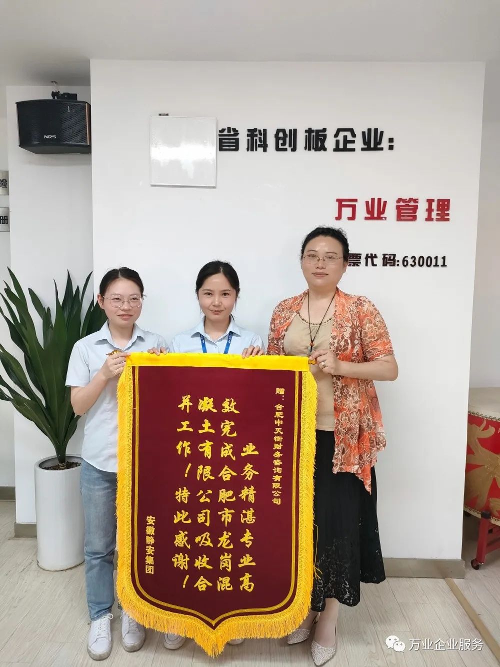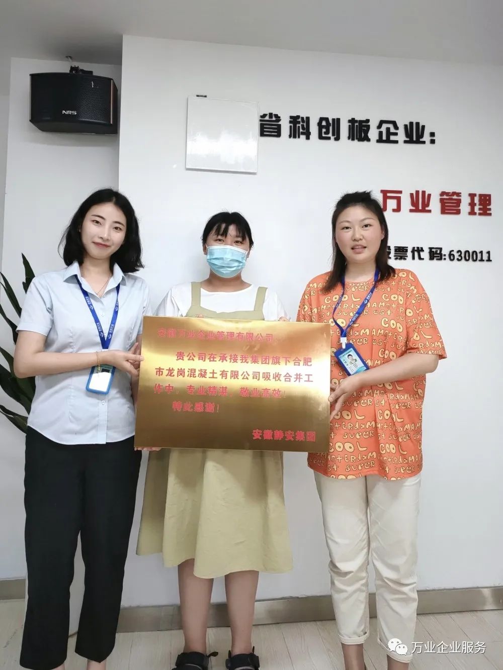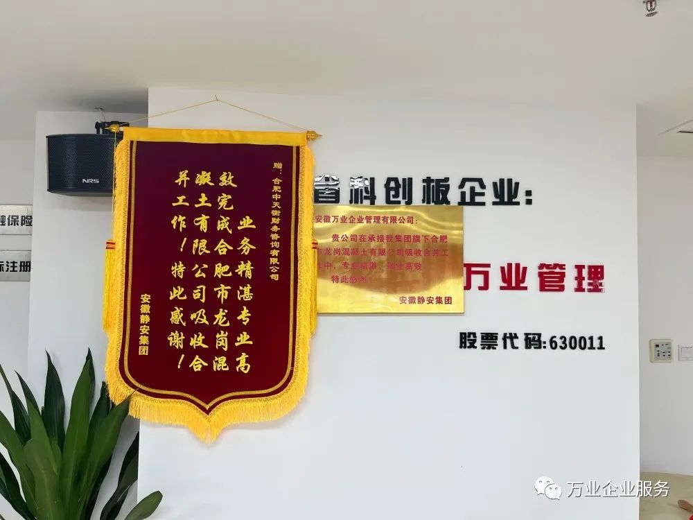 5月26日,安徽靜安集團(tuán)為安徽萬(wàn)業(yè)·中天衡送來(lái)一面錦旗和一塊牌匾。其集團(tuán)代表負(fù)責(zé)人說(shuō):“真是太感謝了,要不是萬(wàn)業(yè)中天衡的鼎力幫助,高效的完成了合肥市龍崗混凝土有限公司吸收合并工作,我們的業(yè)務(wù)也不會(huì)開展的如此順利!”